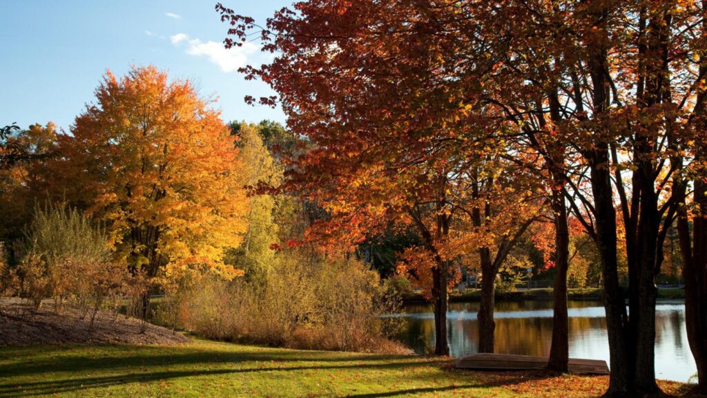 - Walking paths and open lawns, scattered with fallen leaves like confetti, creating a warm contrast to the chilly November air.